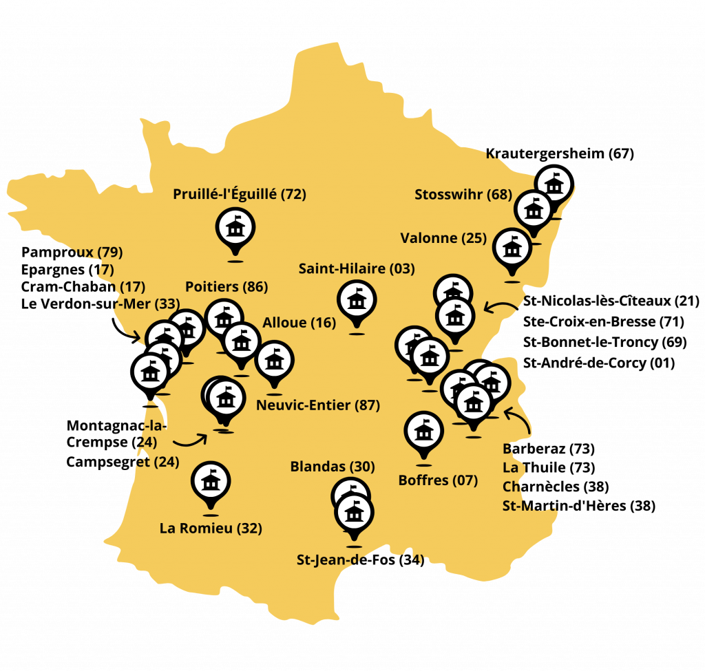 Les points sur la carte témoignent d’une mobilisation nationale : du Massif central aux Alpes, du Jura à l’Ouest de la France, les collectivités montrent qu’il est possible de conjuguer efficacité énergétique et valorisation du bois local grâce au granulé.